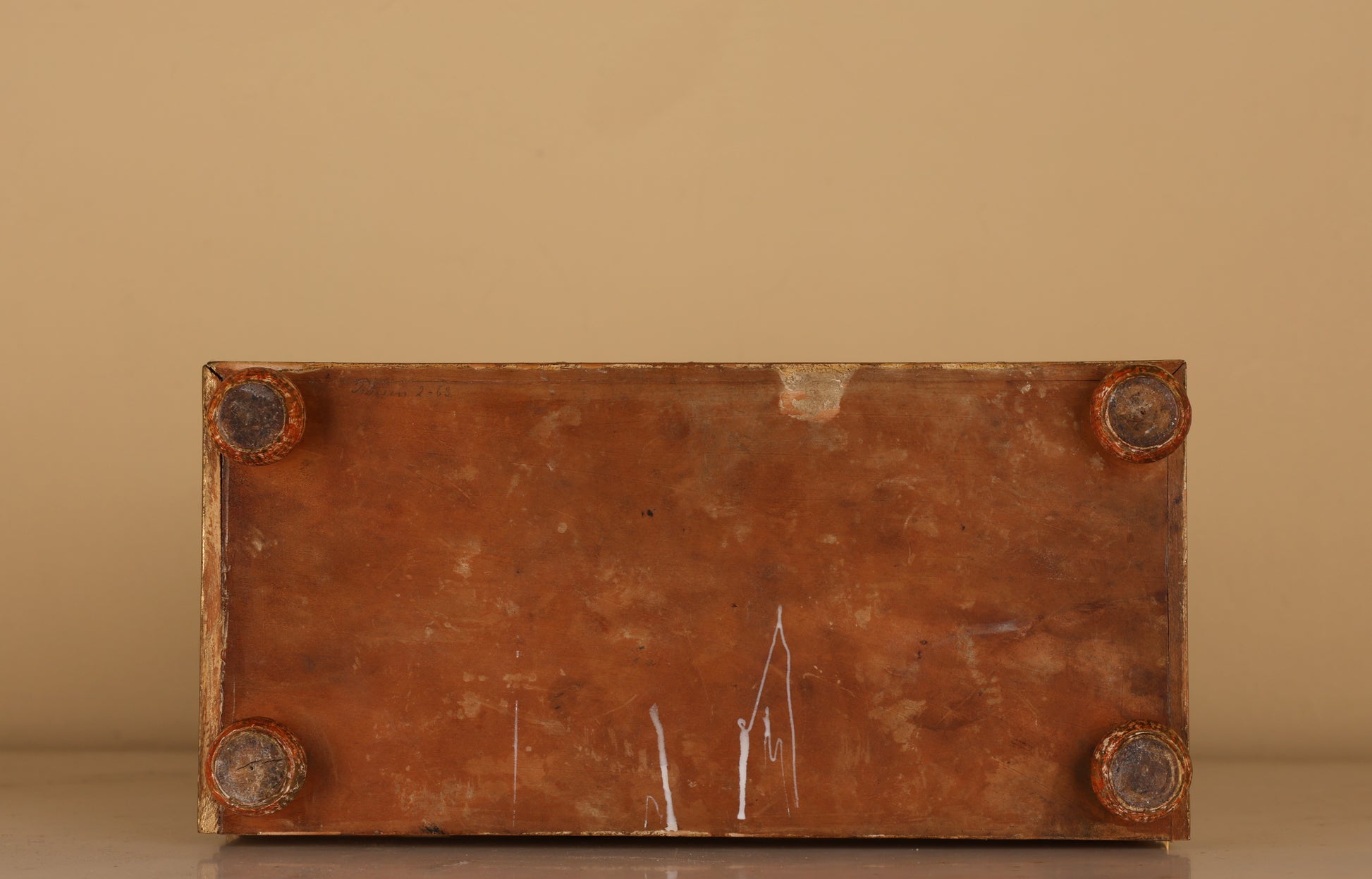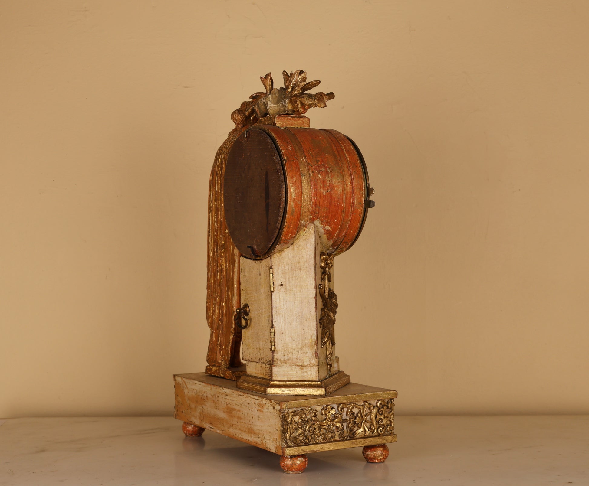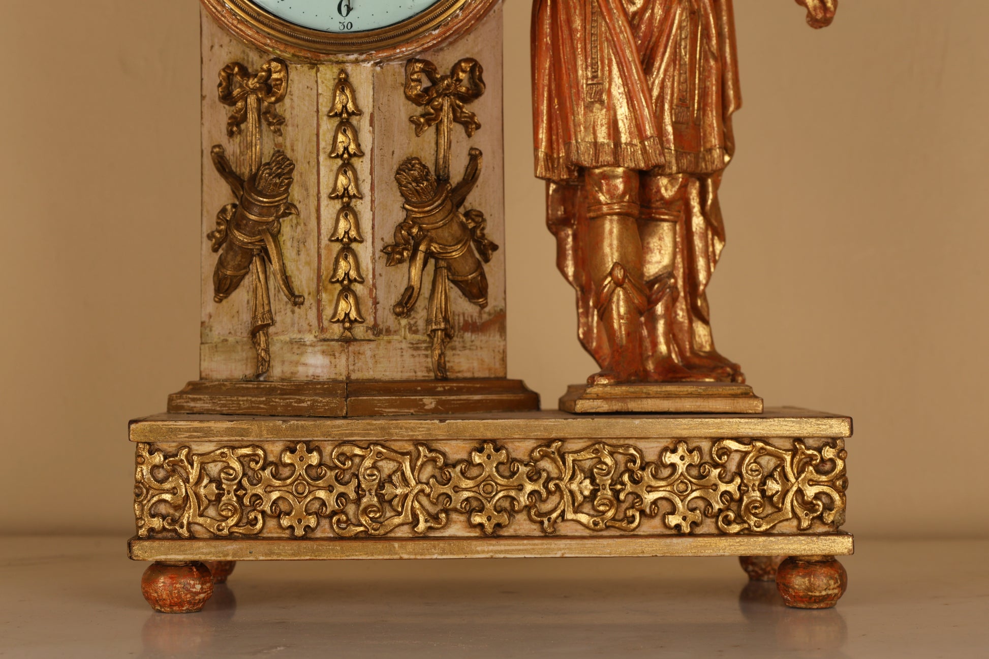 An Empire mantel clock in gilded wood, made in Austria or Germany circa 1820-1830. It features a warrior in classical armor resting his arm atop the clock. The clock's pillar is adorned with bows and arrows, while the base is decorated with typical Empire ornamentation.